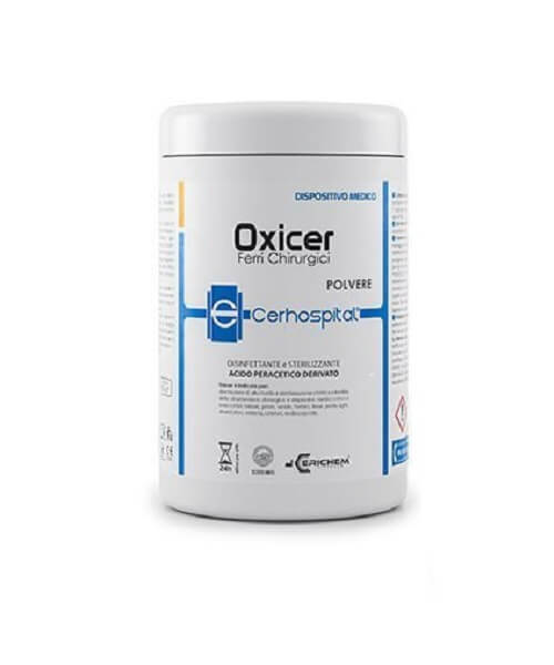 Oxicer è una polvere bianca idrosolubile indicata per la decontaminazione con contemporanea detersione e per la disinfezione di alto livello (STERILIZZAZIONE CHIMICA A FREDDO) rapida e sicura di ferri e strumenti chirurgici in ambito odontoiatrico, ospedaliero e sanitario (podologia).